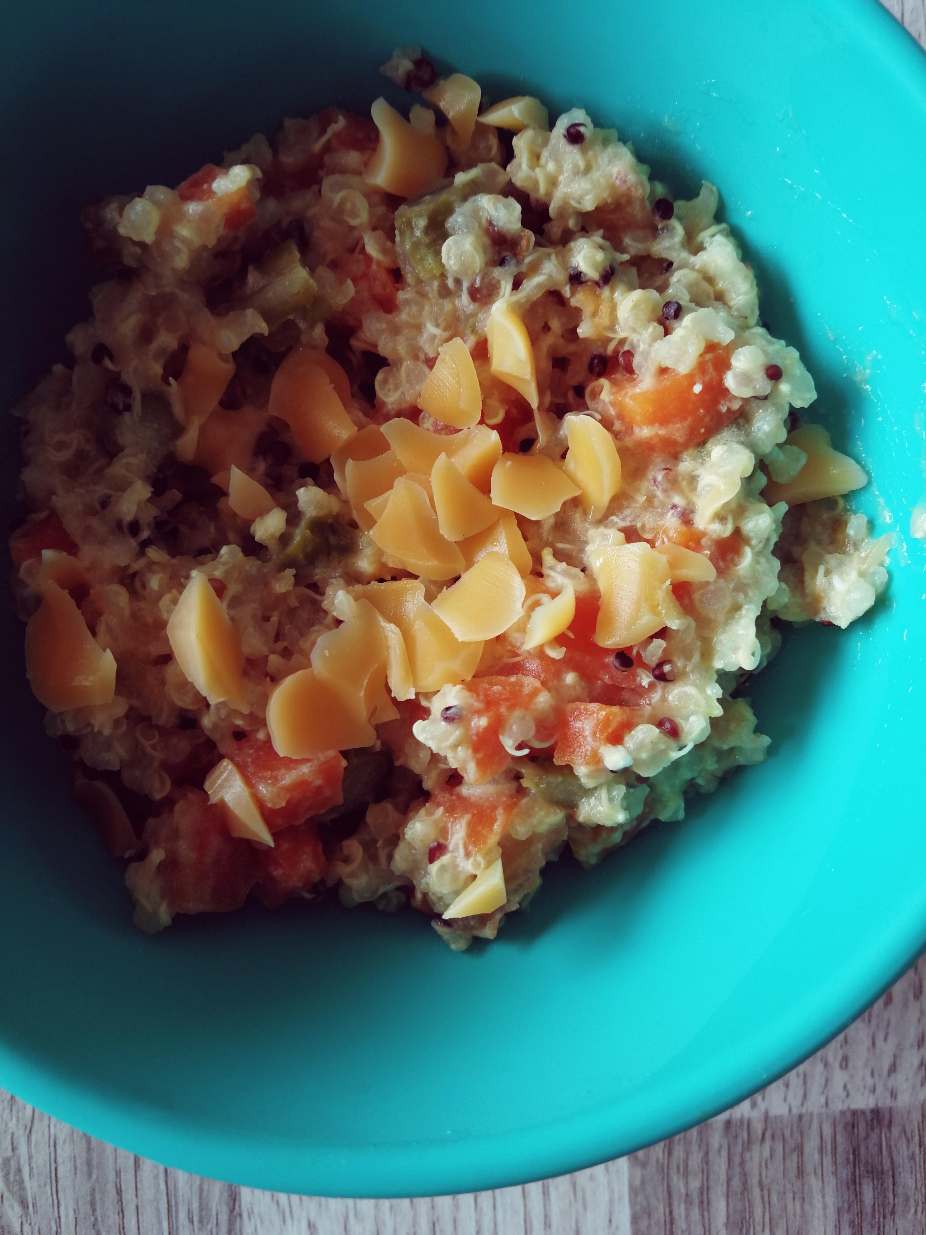 Put quinoa, carrots and asparagus into pan and cover with boiling water. Keep cooking for few minutes until everything is cooked through and soft. Cut tomato into small pieces over it, mixed together, add egg yolks (or whole) keep cooking until egg is cooked through, serve with baby cheese sprinkled over it.